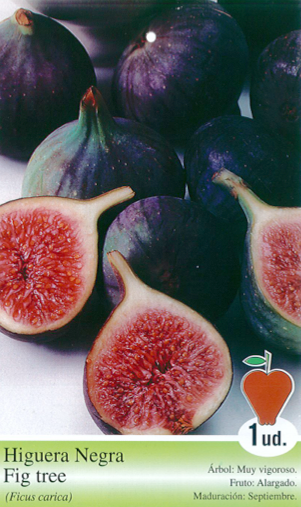 Árbol frutal Higuera negra (Ficus carica) de 2 años en cepellón con bolsa. Árbol: muy vigoroso. Fruto: alargado. Maduración: septiembre.