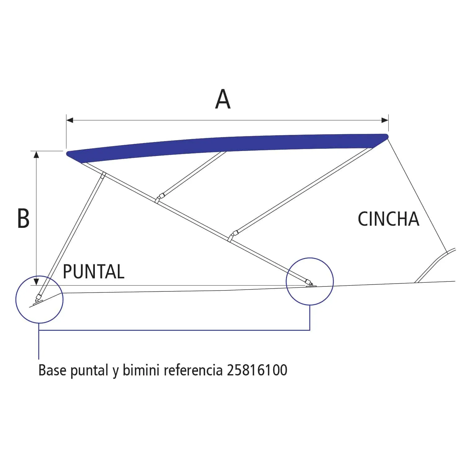 Bimini 3 arcos de acero inoxidable AISI 316, acabado pulido brillante, puntales y base soporte capota 90º incluidos. Lona 100% acrílica tintada en masa Masacril. Incluye funda