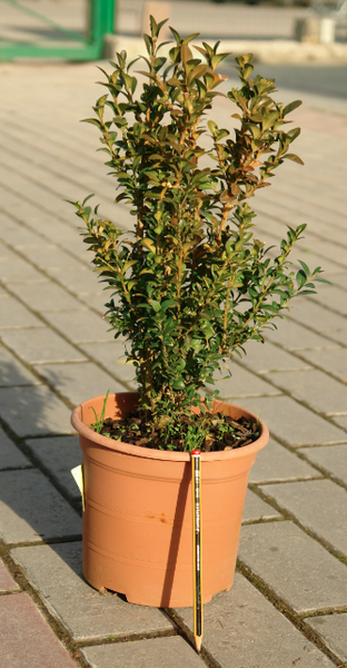 Boj arbustivo (Buxus sempervivens) en maceta de 10 litros. El boj es una buena planta de hoja perenne para macetas. En jardineria es apreciado el boj porque se pueden formar setos y molduras de bajas necesidades de corte (crece lentamente).