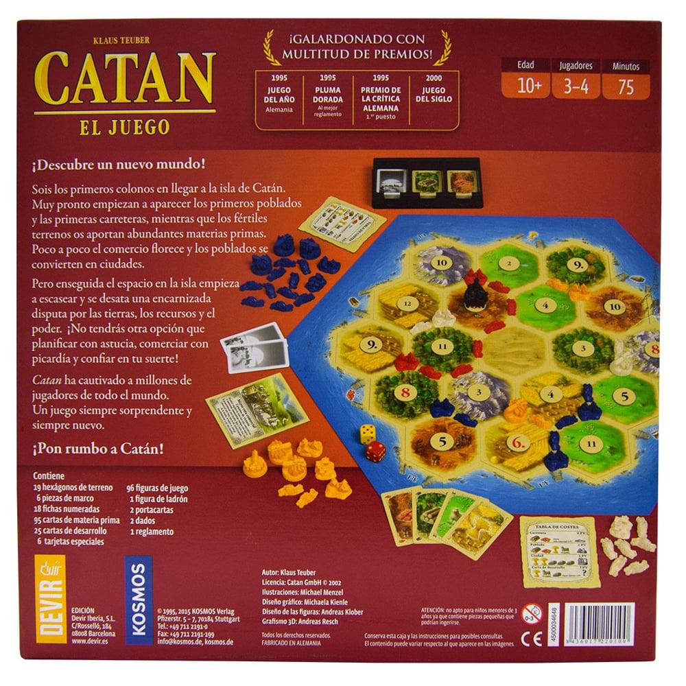 Catan es un juego de mesa para toda la familia que se ha convertido en un fenómeno mundial. … Se trata de un juego que aúna la estrategia, la astucia y la capacidad para negociar y en el que los jugadores tratan de colonizar una isla, Catán, rica en recursos naturales.