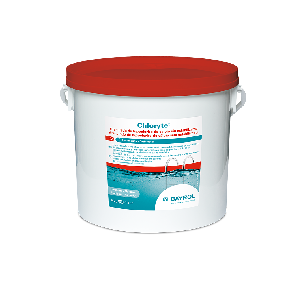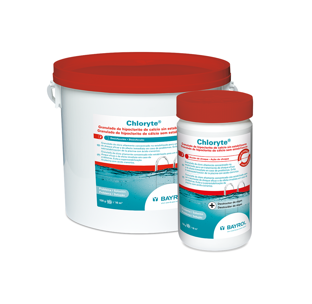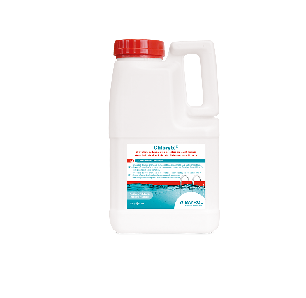 La fórmula de Chloryte, basada en hipoclorito de calcio puro, es altamente concentrada y contiene un 70% de cloro activo. Este cloro no estabilizado se disuelve muy rápidamente y permite un tratamiento de choque inmediato y muy potente. Al disolverse, los gránulos de cloro liberan una gran cantidad de cloro en un período de tiempo muy corto que erradica las impurezas, oxida los microorganismos que perturban el agua y que no pueden ser retenidos por el filtro. Como resultado, en pocas horas, el agua se vuelve cristalina y sana de nuevo, las algas han desaparecido. Chloryte no contiene ningún estabilizador de cloro y evita el riesgo de sobreestabilización de las piscinas tratadas con tabletas de cloro. Disponible en cajas de 1kg (novedad 2021), botellas de 3,3 kg y en cubos de 5 kg y 25 kg.