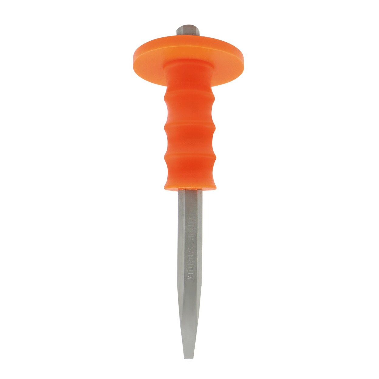 Cincel de hierro de punta 10″, forjado en cromo vanadio endurecido con tratamiento térmico y mango de jebe con protección antigolpes para la mano y para que las vibraciones sean menores. Se usa para golpear o percutir materiales resistentes en albañilería o construcción
