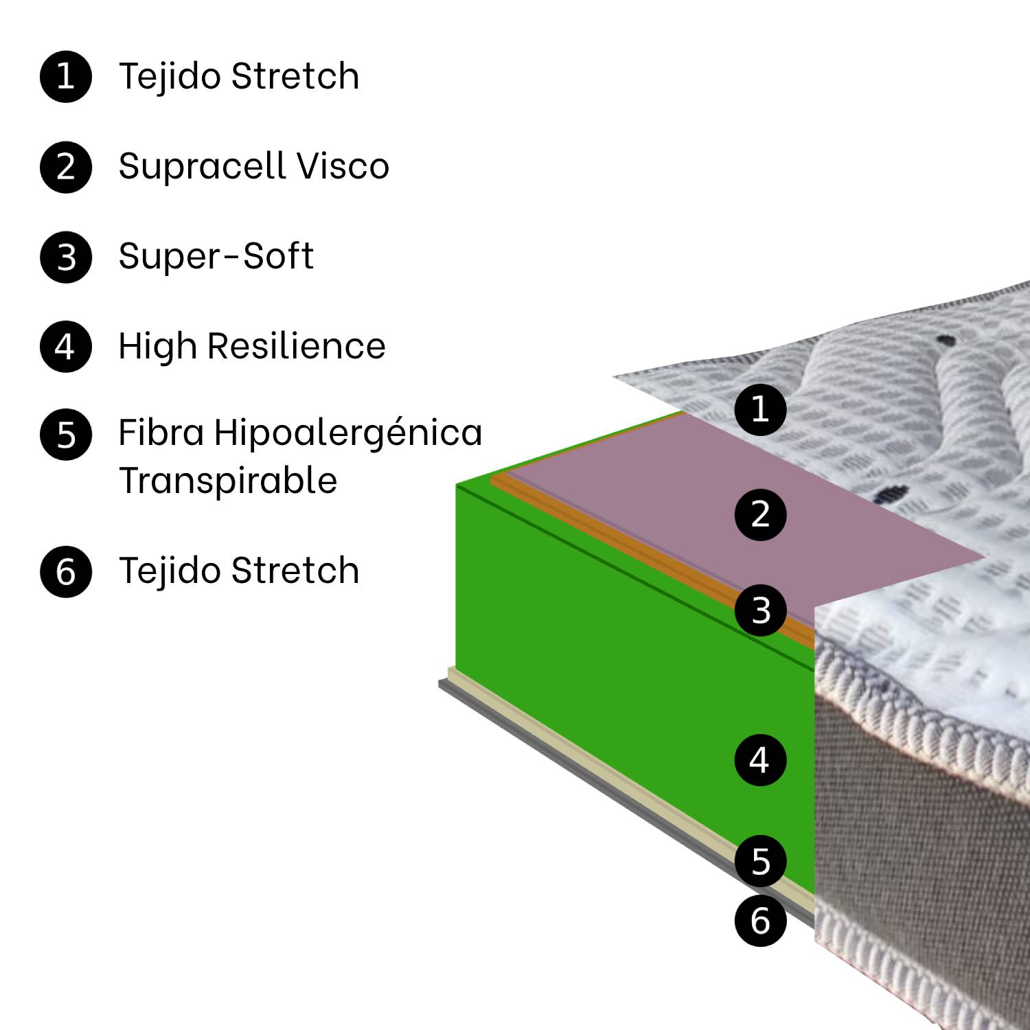 - Cara 1: Material soft de alta densidad con Suprecell Visco para máxima adaptabilidad.