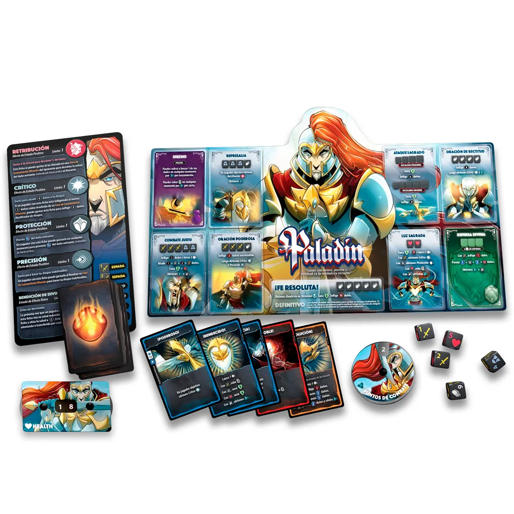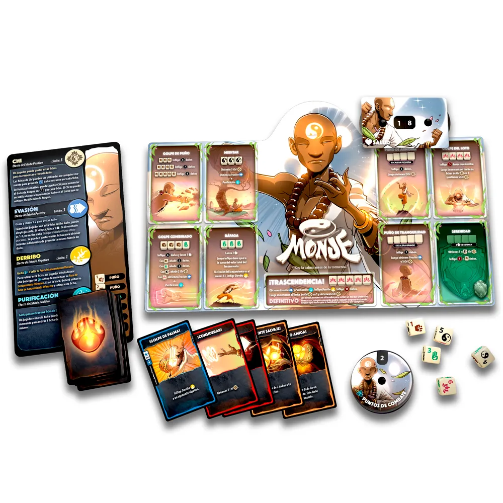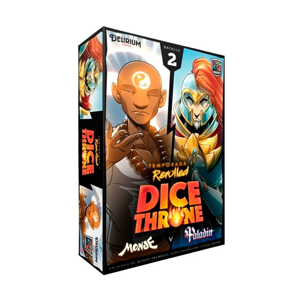 Dice Throne: Monje Vs Paladín es una nueva edición del juego básico Dice Throne, incluyendo dos nuevos héroes legendarios: el Monje y el Paladín. El Monje es todo un maestro en el arte del Chi y puede canalizar su energía para contener los ataques de sus rivales. Pero no sólo se limita a contemplar y contener, sino que también puede tener un ataque mortal. El Paladín, por su parte, golpea con su espada con fuerza y carácter, siempre confiado en que la Divinidad está con él y que su victoria está asegurada.