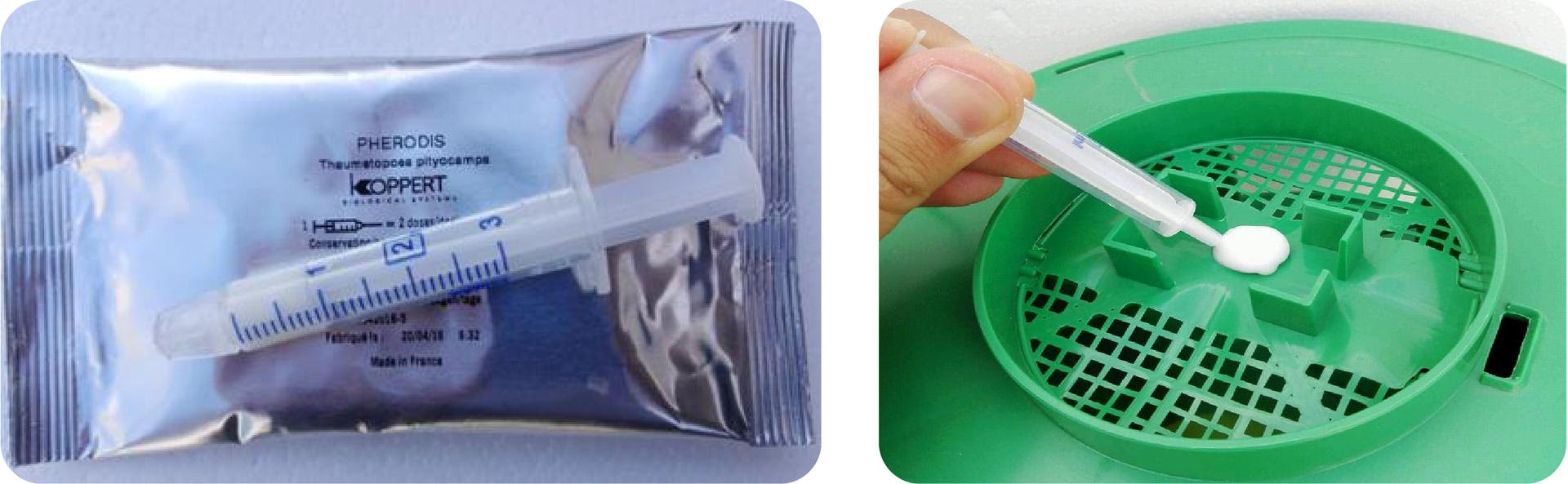 - Formato de Jeringa Innovador: Nuestras feromonas vienen en una jeringa de plástico fácil de manejar, conteniendo una pasta concentrada con feromonas. Cada gota es esencial para garantizar una captura efectiva.