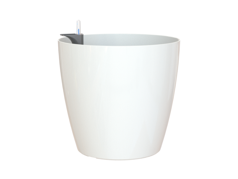 Maceta redonda de diseño moderno y elegante con sistema de riego automático, bandeja de reserva de agua e indicador de nivel de agua incluido.