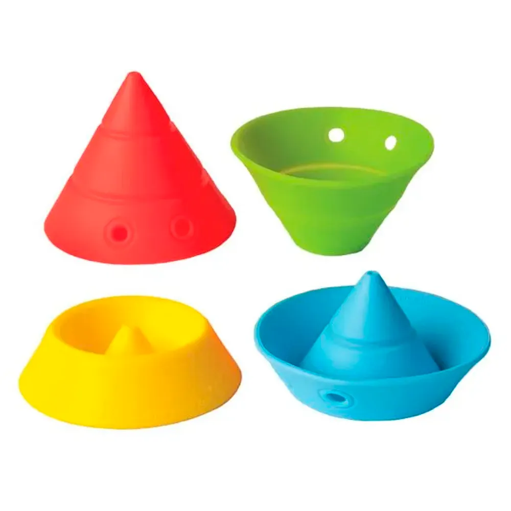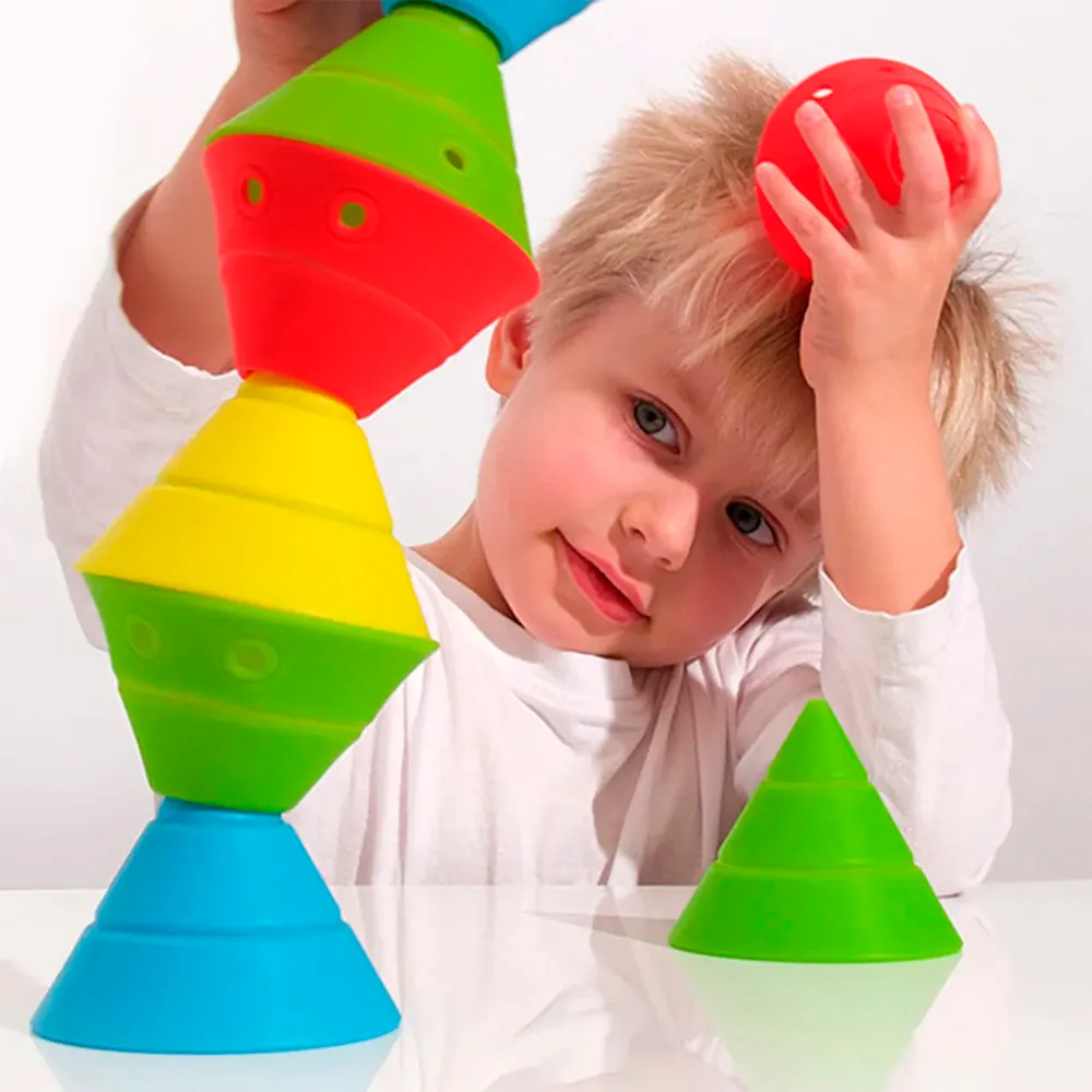 Hix es un juguete versátil de nueva construcción que consta de cuatro conos (rojo, azul, amarillo y verde) convertibles hechos de goma elástica de silicona. Cada cono se transforma en cuatro formas básicas que pueden apilarse y anidarse en muchas configuraciones diferentes. Hix es una delicia para moverse y hace que la geometría sea accesible y divertida para todas las edades. Entrena juguetonamente la habilidad visual-espacial, la coordinación mano-ojo y las habilidades motrices finas.
