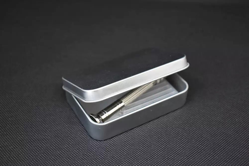 El taladro viene en una conveniente caja de metal, que luego puede usarse para almacenar cualquier objeto.