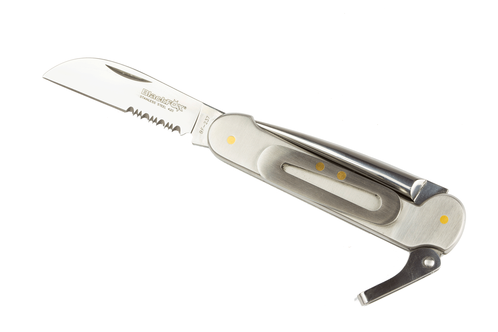 Navaja marinera Fox profesional de alta calidad «Fox Sailing». Fabricada en acero inoxidable AISI 420C. Lleva punzón deshace nudos y también abre grilletes.
