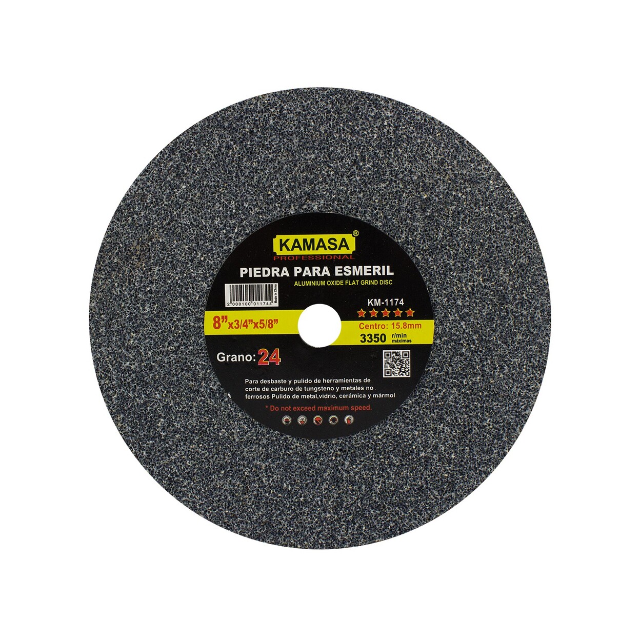 Piedra rueda abrasiva de óxido de aluminio con grano A24 en color gris, diseñada para desbaste y afilado en metales y materiales resistentes. Sus dimensiones (8″ diámetro x 3/4″ ancho x 5/8″ diámetro interior) la hacen compatible con amoladoras y herramientas rotativas estándar, ofreciendo alto rendimiento en tareas industriales y mecánicas.