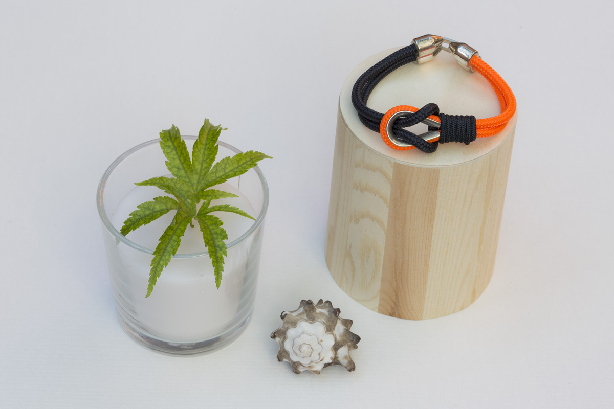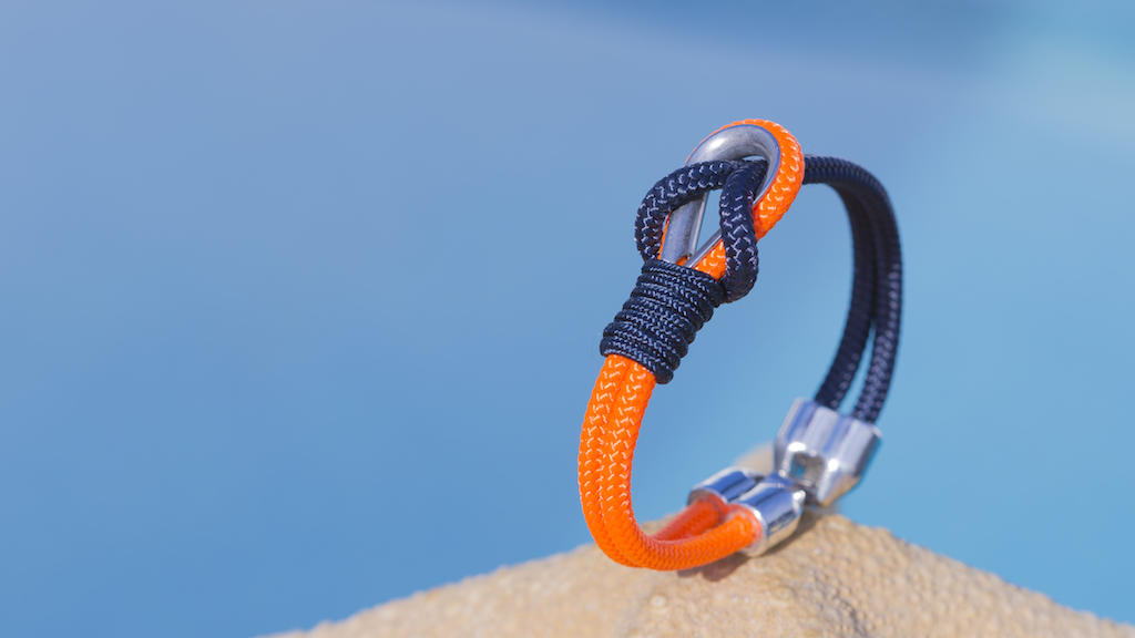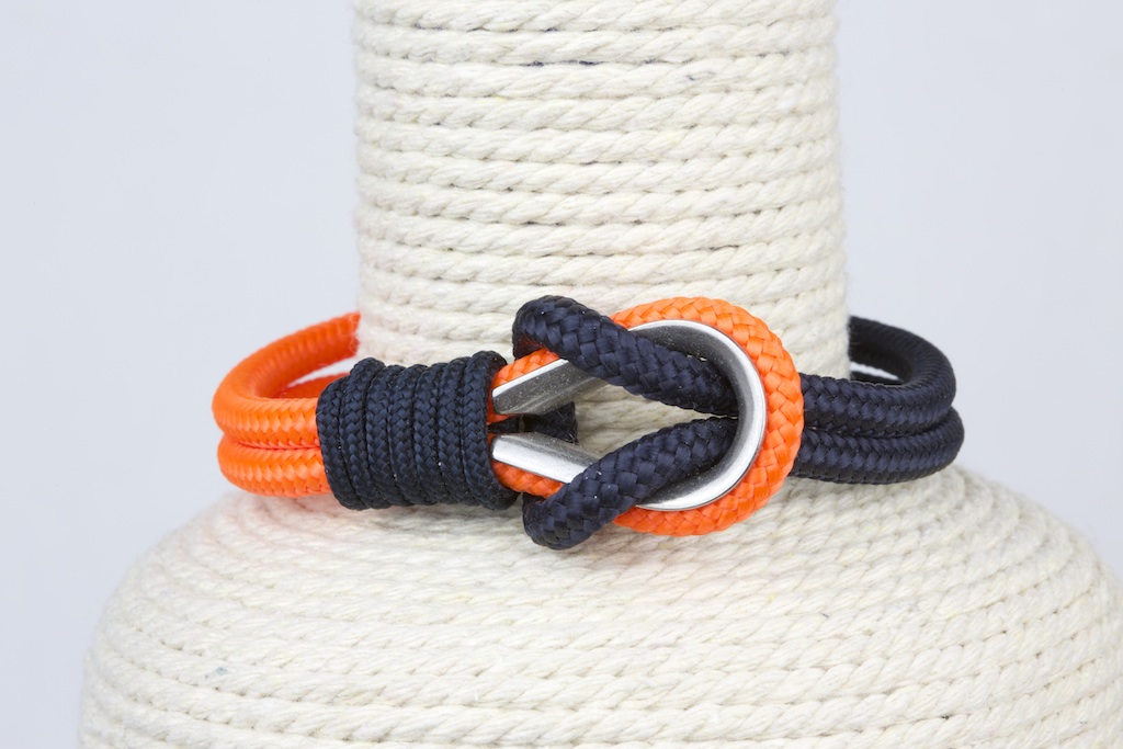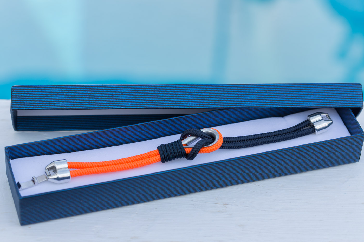 Pulsera marinera de azul y naranja artesanal hecha con driza y guardacabos de acero inoxidable.