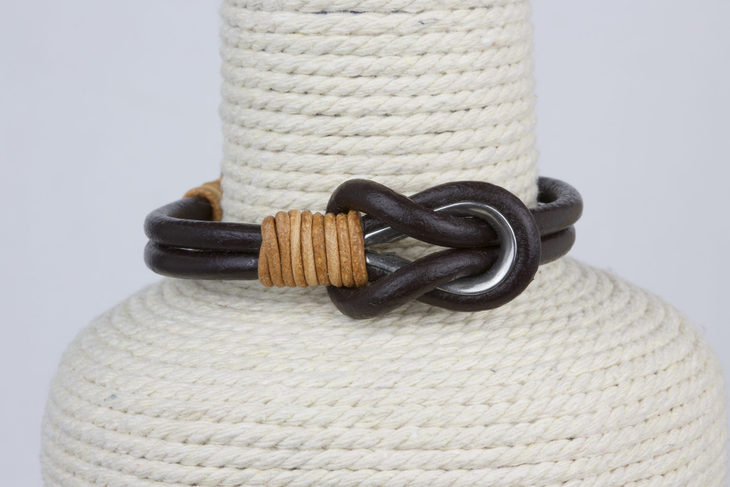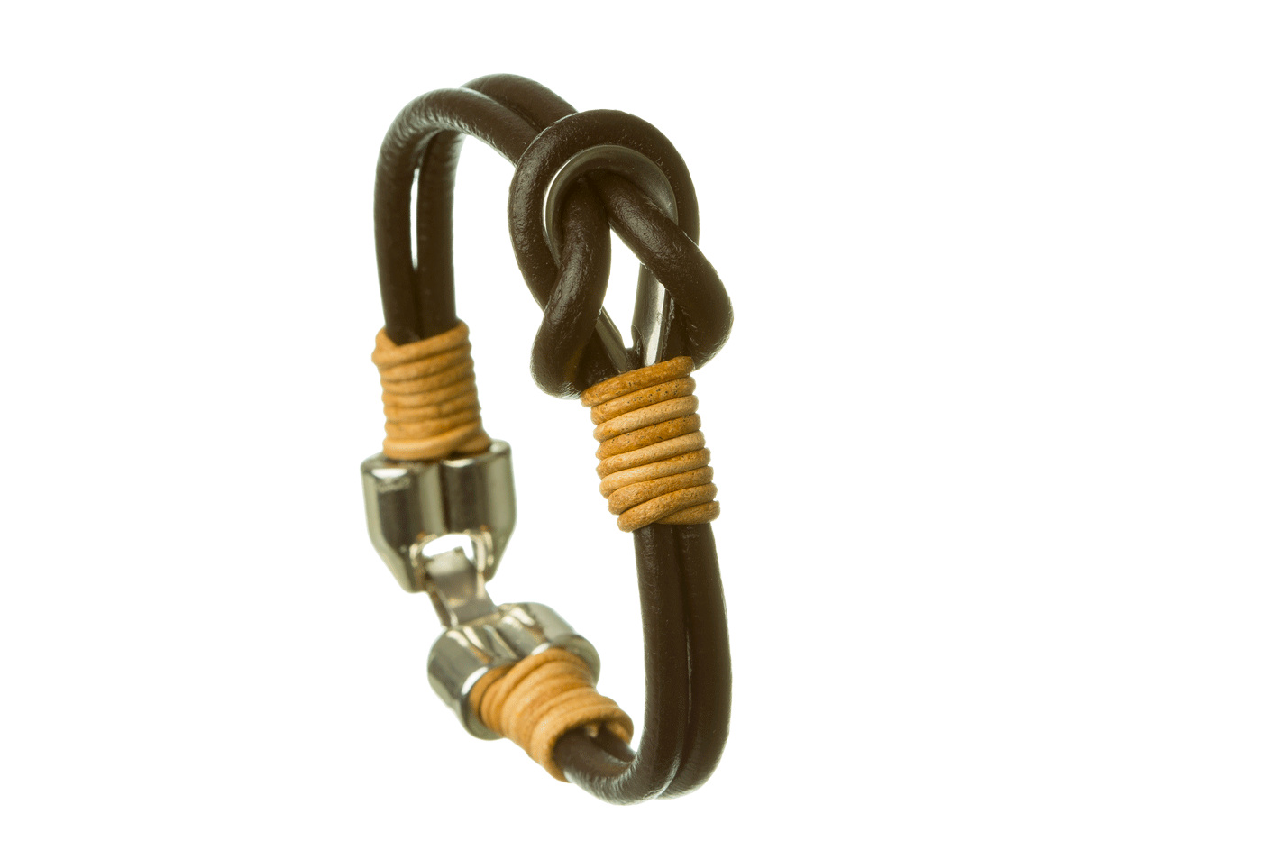 Las pulseras están elaboradas de forma artesanal con guardacabos de acero inoxidable, cuero tratado y cierre de zamak.