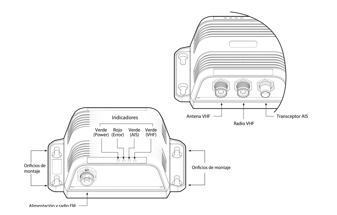 Comparte una sola antena VHF con un transceptor AIS y un radioteléfono VHF.