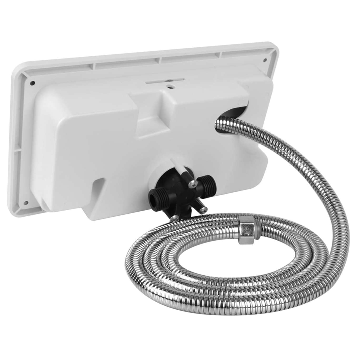 La Toma de Ducha Externa Agua Fría/Caliente está diseñada para resistir ante cualquier condición meteorológica y está fabricada con materiales de alta calidad resistentes a los rayos UV. Es de color blanco, también disponible en color negro. (Consúltanos para más información). Gracias a su cerradura podrás mantenerla de manera segura. Incluye juego de llaves.