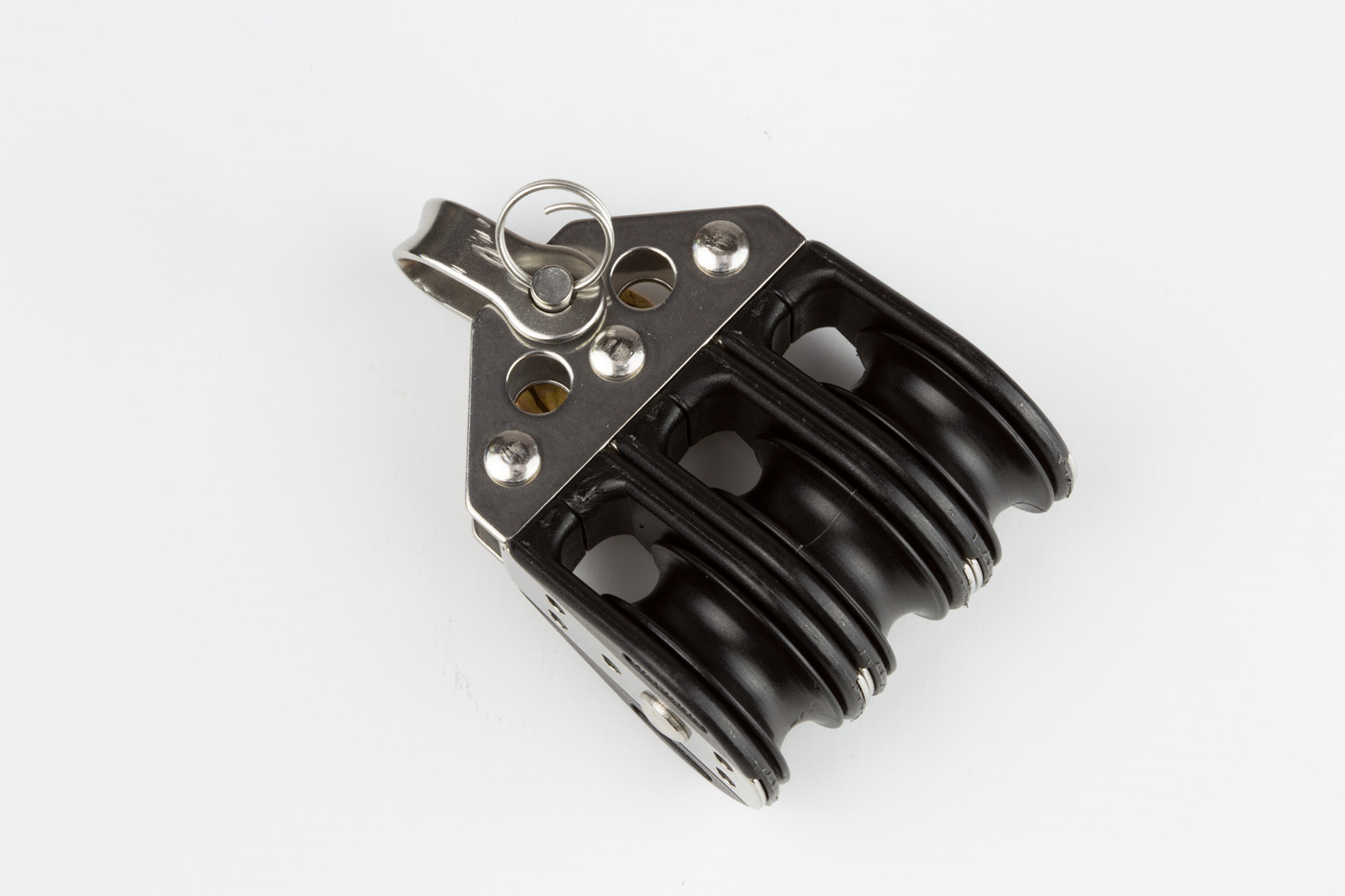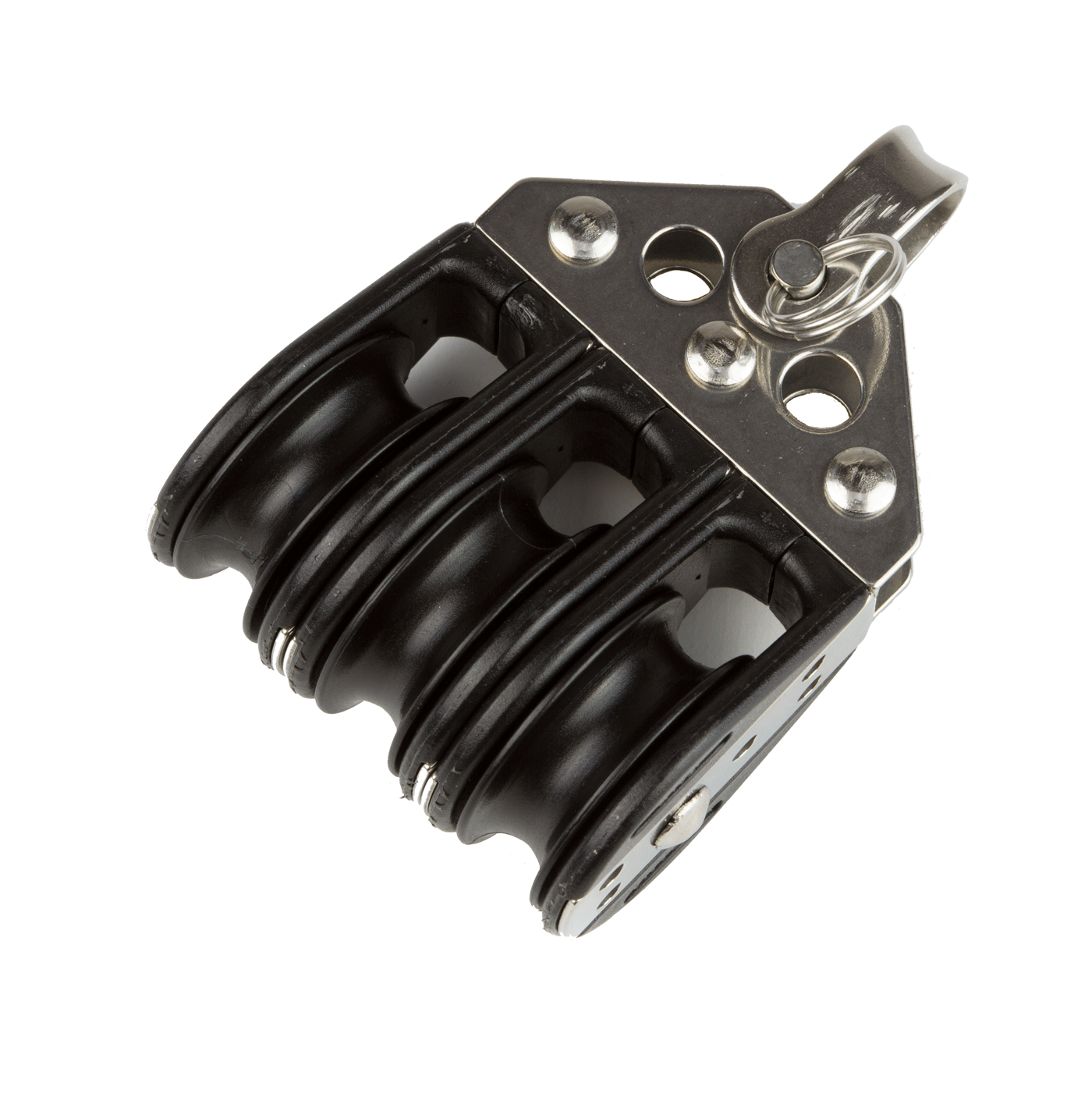 Triple polea de 28 mm con rodamientos para cabo de hasta 8 mm de grosor.