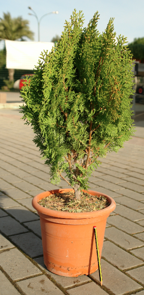 Tuja (Thuja Orientalis Aurea Nana) en maceta de 5 litros. El área natural de origen de la Tuja es muy extensa, desde Irán hasta China y Corea. Se cultiva en Oriente desde la Antigüedad, en templos y cementerios, sobre todo en los jardines japoneses. La Tuja Orientalis Aurea Nana es una variedad de silueta piramidal, con preciosos tonos dorados. Florece en primavera. Thuja orientalis es utilizada para repoblaciones y en jardinería sólo en setos y barreras contra el viento. También son utilizados aislados, en rocallas, grupos de tres, macetas…